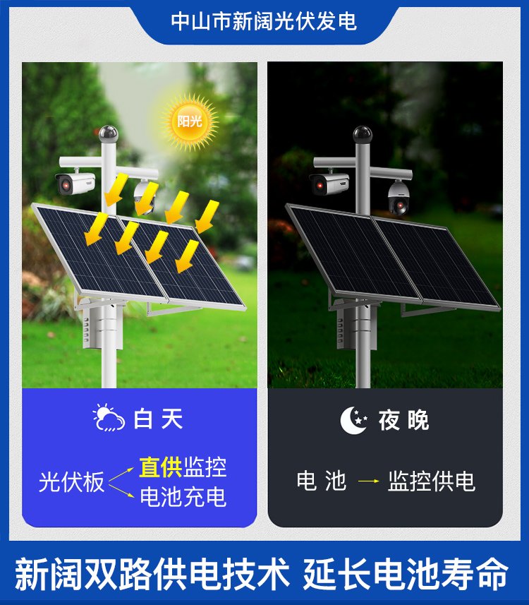 新闊雙路供電技術(shù),白天太陽(yáng)能板直接給監(jiān)控供電,多余電量存進(jìn)電池,減少電池循環(huán)次數(shù),電池延長(zhǎng)壽命。